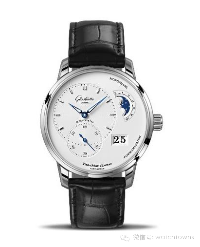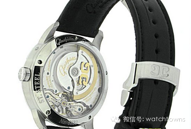 格拉苏蒂原创偏心月相腕表系列1-90-02-42-32-05腕表,自动机械机芯,精钢材质,具有日期和月相功能,表径40毫米。通过背透可以看到具有鲜明德国东部制表特色的细节,比如3/4夹板、黄金套筒、鹅颈微调等。