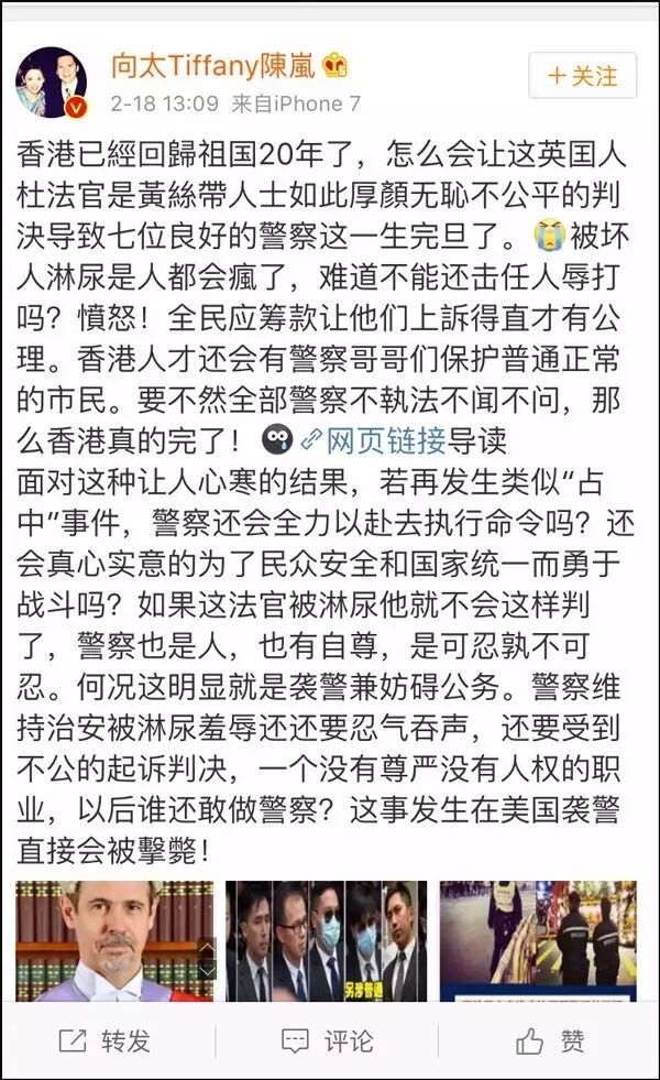 【观察者网综合】负责2014年“占中”清场的7名香港警察全部被判两年,此事引发高度关注。今天(2月18日)中午,向华强的夫人、向太陈岚在微博疾呼,“英国人杜法官是黄丝带人士,如此厚颜无耻、不公平的判决导致7位良好的警察这一生完蛋了,愤怒!”