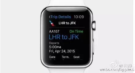 6、快到机场时,Apple Watch 会自动显示你 Passbook 里的登机牌。你能用 Apple Watch 上的 SPG app,办理酒店入住、打开酒店房门。