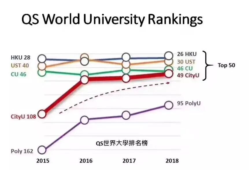 据港媒报道称,香港现在也超越了伦敦,成为全球唯一一个有用5所世界百强大学的城市。来看看近年来香港高校的排名走势: