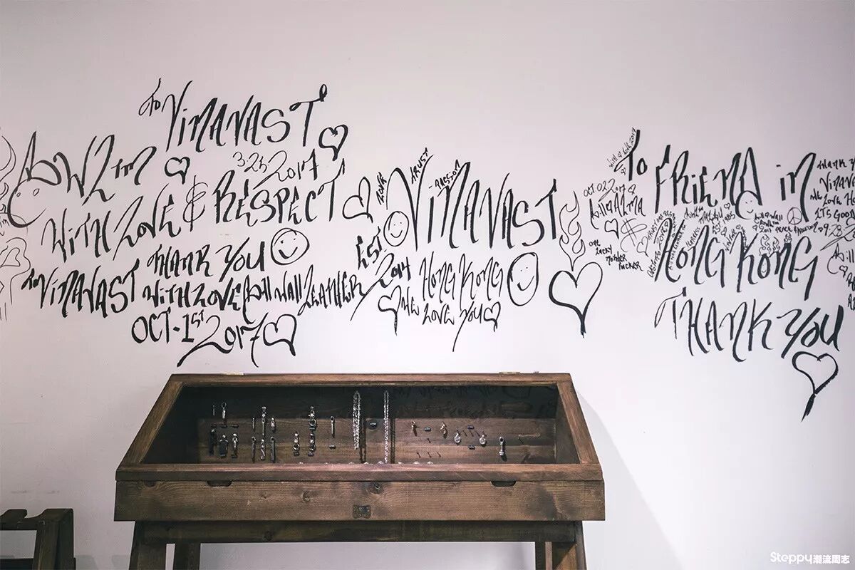 所以,Bill Wall 在 vinavast 举行见面会或是活动的时候,在店里专属陈列柜上方的白墙上留下「Friend」、「Happy Face」、「Thank You」的字眼或图案,来传达出其品牌的信念「Make a happy face,Have a nice day!」