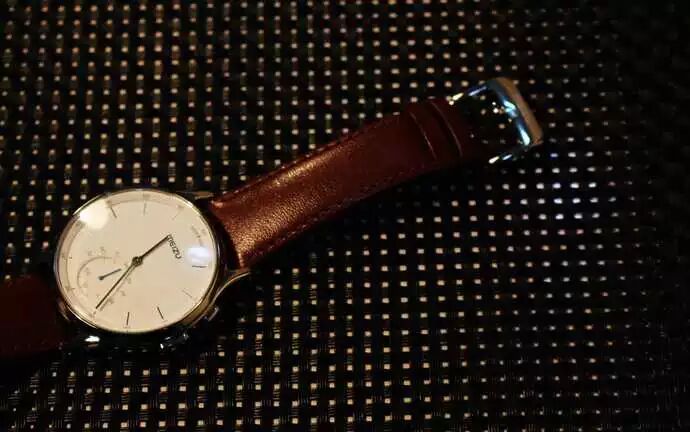 在男士手表中38mm的小尺寸之外,魅族智能手表表盘直径42mm是男士手表的最小量级了,时针分针的两个指针体现了轻智能的理念,“12点”刻度处的“swiss movt”字样表明这款手表选用了瑞士原厂表芯,但并非瑞士生产,否则会标注为swiss mode。