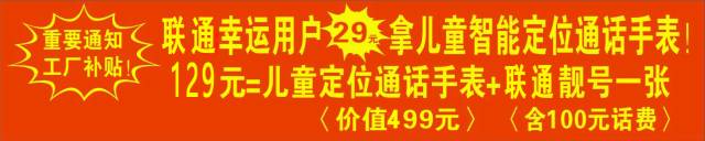 好机会!联通幸运用户存100元话费+29元抢购儿童定位电话手表!机会难得,赶快来抢,不然没得了!