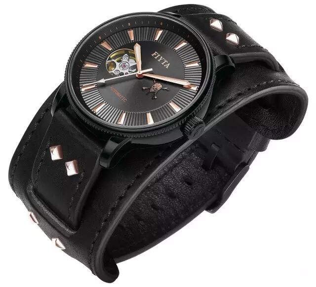 这款腕表表径42mm,厚11.6mm,表壳采用不锈钢材质,搭载进口自动上链机械机芯,防水30米。表带上配备着一条可拆卸的腕带。八颗硬朗的轮廓和锐利的玫瑰金铆钉,为表款整体凹出独特的造型感。