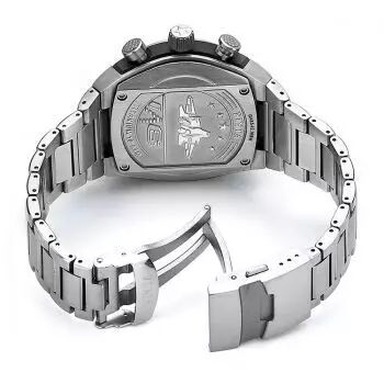 这款腕表表径45mm,厚13.9mm,表壳、表冠、表带等均采用钛合金材质,蓝宝石水晶玻璃表镜。搭载自动上链机械机芯,密底设计,底盖镌刻浮雕感战斗机,防水100米。