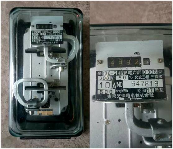 ▲ TOSHIBA-東芝电表,为闸北淘回的三相工业电表,尺寸相当于普通2枚大小,外壳为玻璃制造,制造于昭和17年也就是1942年,正值第二次世界大战,停转之日读数为:2992。