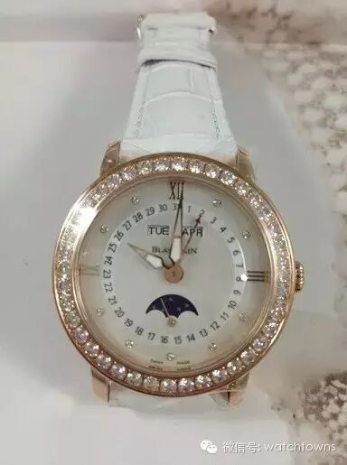 宝珀月相系列3663-2954-55B腕表,自动机械机芯,18k玫瑰金材质,表圈和时标均镶钻,白色珍珠贝母表盘,具备日期、星期、月份和月相等功能,背透,白色鳄鱼皮表带,表径35mm,参考价格219000元(以实际价格为准),属于顶级腕表。
