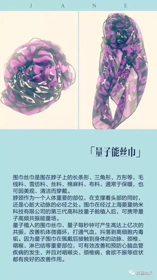 我们的量子产品有,推出光波量子能富氢水杯(调理三高和痛风),量子文胸(快速预防和缓解乳腺增生),量子护颈护腰护膝(改善肩周、腰椎以及关节炎等问题)。量子眼镜、量子手机贴、量子防辐射卡、量子围巾、量子男士内裤,量子美颜喷雾等。