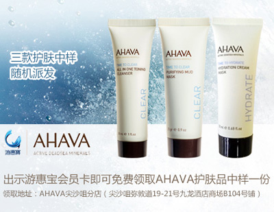 》出示游惠宝会员卡,即可免费领取AHAVA护肤品中样一份。(VIP中样优惠领取的有效期为12月05日-01月04日)
