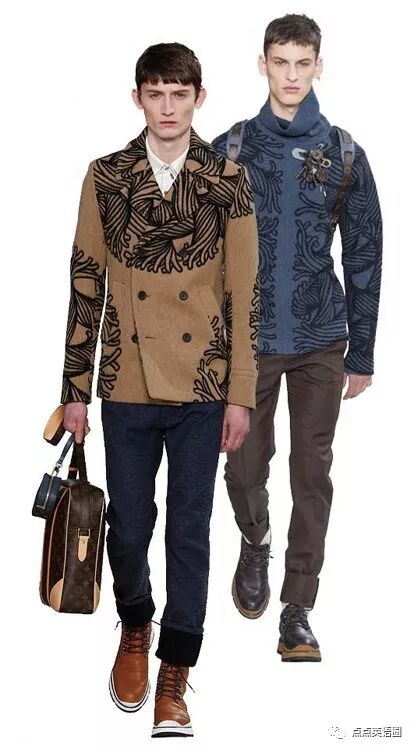 这一季路易威登男装首先映入眼帘的就是很特别的花纹图案,这些图案是传奇设计师Christopher Nemeth的标志性图案,是Kim Jones在向这位他喜欢的设计师致敬。钮扣、绳索、别针这些曾经的配件,体现在了这季Kim Jones的设计当中,这些元素经过Kim的转化,结合上比较实用的男装款式,呈现出了更符合街头潮流、且更具年轻活力的男装。
