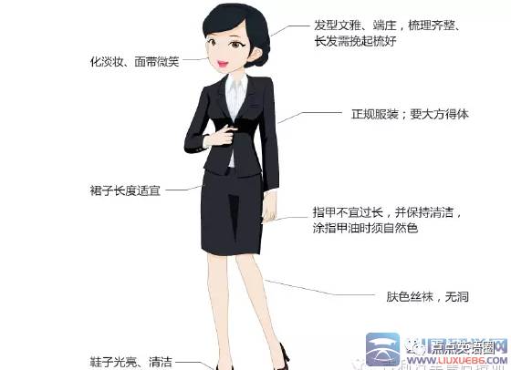 2、裙子长短适度,不能过短或过长:标准职业裙装按长度来分有三种:及膝型、过膝型(不能太长)、超短型(不能高于膝盖15厘米)