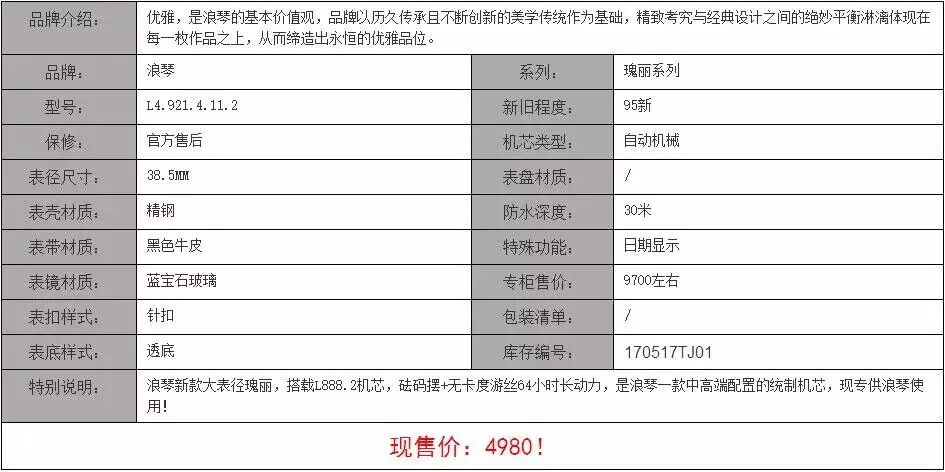 浪琴瑰丽系列白盘钢款日历针扣手自动机械表L4.921.4.11.2 现售价:4980!170517TJ01