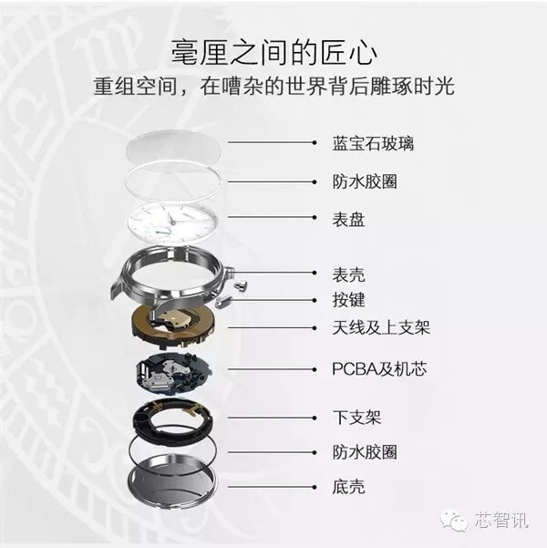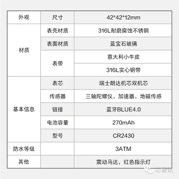 具体参数方面,机身厚度为12mm,表芯采用的是瑞士朗达机芯,内置三轴陀螺仪、加速度计、地磁传感器,支持蓝牙4.0,电池容量为270mAh。