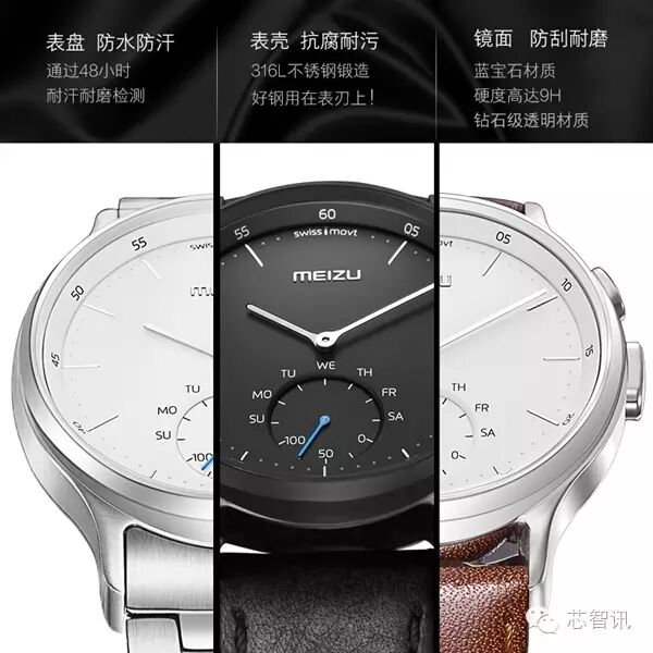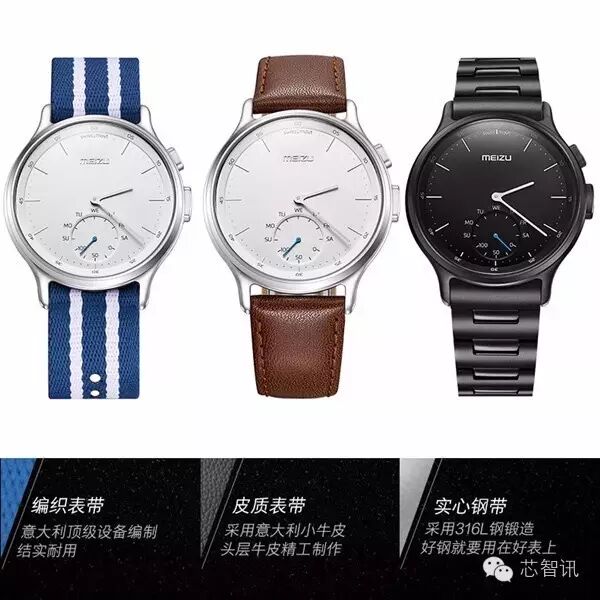 和以往智能手表不同的是,魅族轻智能手表mix采用是石英/机械表+智能传感器的设计,依然保留了传统机械报的外观,表身采用316L不锈钢打造,表面玻璃为蓝宝石材质。表带提供编织、皮质以及316L钢表带三种材质。