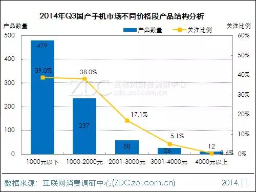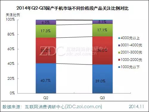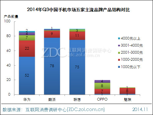 2014年Q3国产手机市场不同价格段产品结构分析