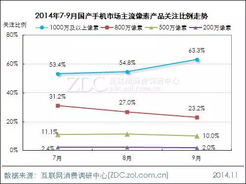 从走势来看,9月搭载1000万及以上像素的国产手机关注度出现大幅度增长,达到63.3%,较7月增长了近10个百分点。800万像素机型关注度则呈直线下滑走势,9月其关注度降至23.2%,较7月大幅下降8%。