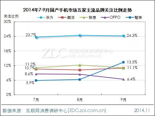 第三季度国产手机市场品牌关注格局的变动应该说是必然的,华为现在推出新品的速度目前来看,没有品牌能够与之匹及。而魅族的市场号召力还是极强的,新品发布引发的用户关注度非常集中。