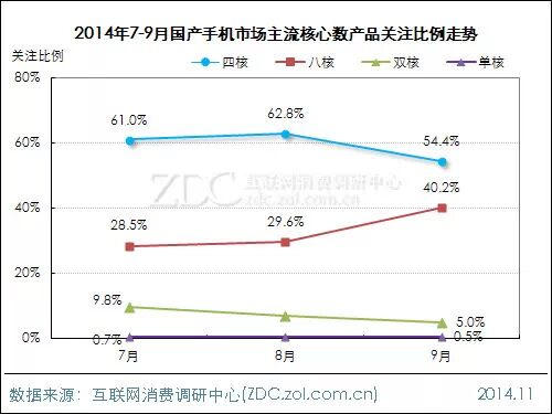 从走势来看,八核机型的关注度9月达到40.2%,较7月大幅增长近12个百分点。四核机型关注度虽然在8月小幅上扬,但9月出现大幅度的下滑,降至54.4%。双核机型关注度亦呈下滑态势。