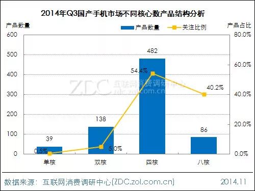 从产品数量来看,国产手机中,搭载四核处理器的机型数量最多,达到482款,双核机型数量仅为138款,八核机型目前数量更少,不足100款。但八核机型的关注度涨势强劲。