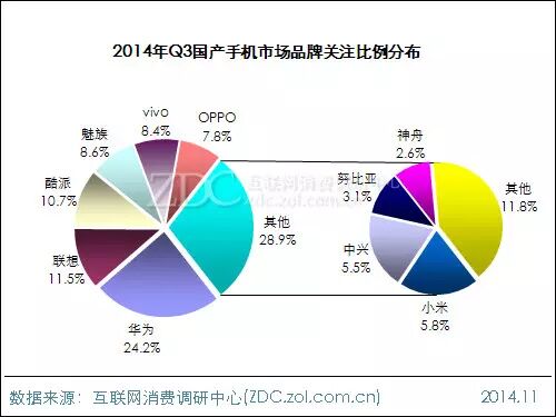 2014年Q3中国国产手机市场品牌关注比例分布