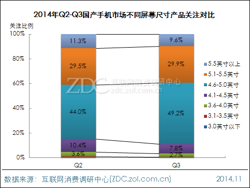 2014Q2-Q3中国国产手机市场不同屏幕尺寸产品关注对比