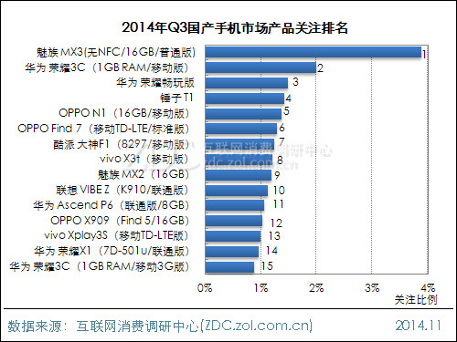 从产品关注来看,第三季度魅族 MX3(无NFC/16GB/普通版)以3.9%的关注比例高居榜首,遥遥领先于其他上榜机型。华为 荣耀3C(1GB RAM/移动版)仍居第二,关注比例为2.0%。华为另外一款机型华为 荣耀畅玩版居第三。
