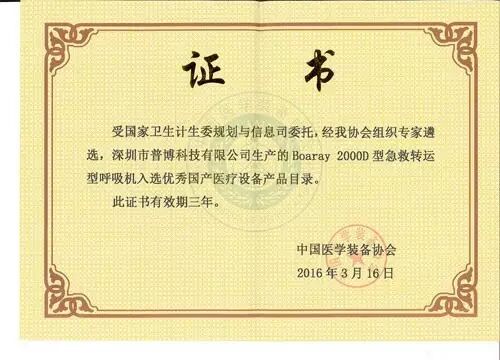 普博系列产品在2016年参加由中国医学装备协会组织、专家遴选,入选为优秀国产医疗设备的企业及产品目录。并于2017年7月21日--23日期间,在苏州举办的中国医学装备协会第26届学术年会暨首届医学装备技术与应用大会上颁发了证书。Boaray2000D型急救转运型呼吸机成功获得优秀国产医疗设备产品目录证书。