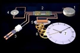 石英腕表的核心包含集成电路。在电池供应的电能作用下,石英振荡器震动,划分时间。电源为寿命数年的小型电池。石英振荡器将电池的能量转化成震动,以划分时间。