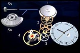 一只标准机械腕表有约130件组件,组装在三个分组装之中,即能量来源、控制部件及显示部分。设有复杂功能(计时、日历、月相、回零针等)的腕表自然有较多组件。齿轮系传导出弹簧所供应的能量。擒纵装置传导脉冲,而摆轮划分时间。转子透过人工或是自动上炼拧紧弹簧。