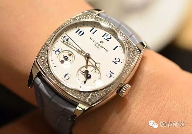 其实很多的机械女表相比男表主要是个头儿变小了,外观变得秀气了,比如增加了镶钻、彩色等元素。以这枚江诗丹顿HARMONY系列7805S/000G-B052女表(上图)为例,搭载自动机械机芯,通过背透可以欣赏到精美的机芯,我们会发现,这枚腕表18K白金材质的表壳上有密集镶钻,表圈共镶有88颗精美钻石,总重达1.20克拉,而且是浅蓝色鳄鱼皮表带,这也是绝大部分男表都不会采用的颜色,另外这枚腕表表径为37x46.6毫米,具有双时区功能。