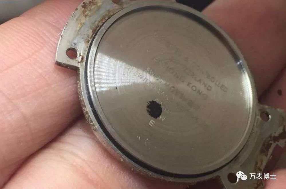 后面我们的师傅拆开之后发现换电池的店员在更换电池的时候并没有一同更换表底后盖的防水圈。所以导致在更换了电池之后手表的防水性能薄弱。
