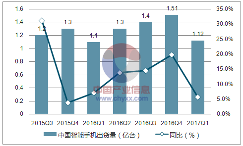 2015Q3-2017Q1中国智能手机出货量(数据来源:中国产业信息网)