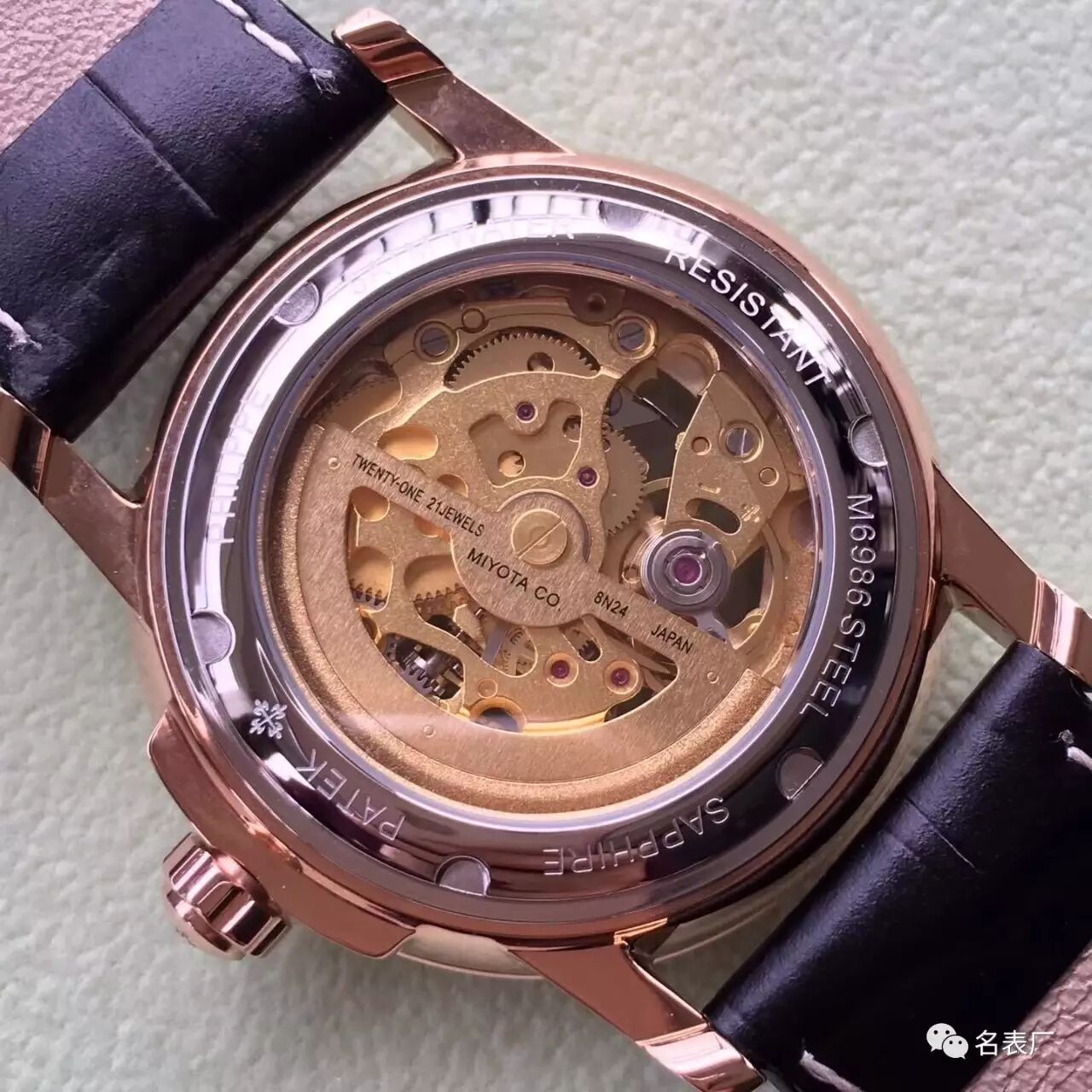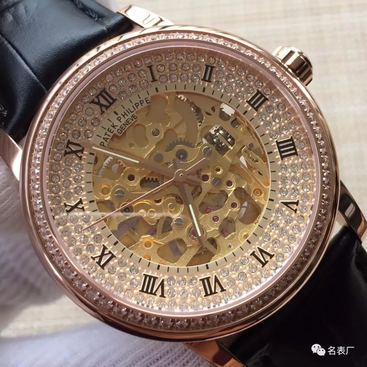 002980 百达翡丽“镂空”全自动机械表,纯进口全自动机芯 蓝宝石镜面 表盘尺寸40mm 镶钻面板 夜光指针 小牛皮表带 316精钢表壳,全镂空设计 能够清晰看到机芯的每个齿轮都在带动着时间的运转,奢华富有内涵。