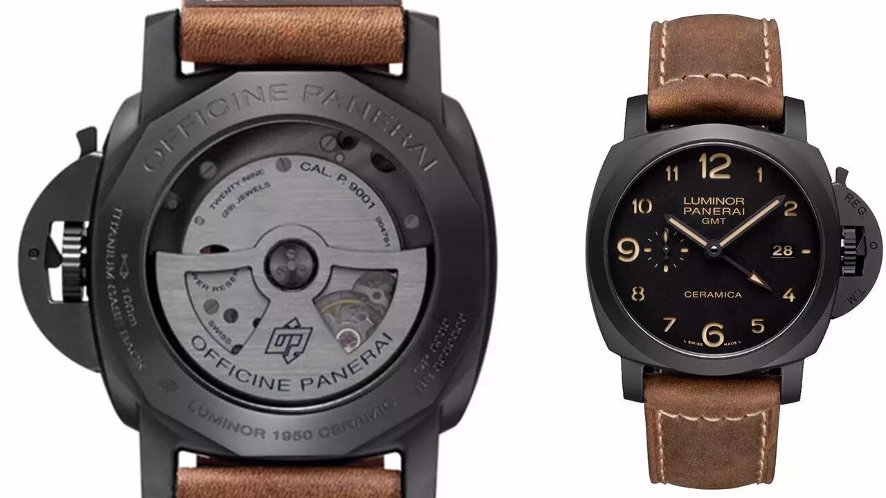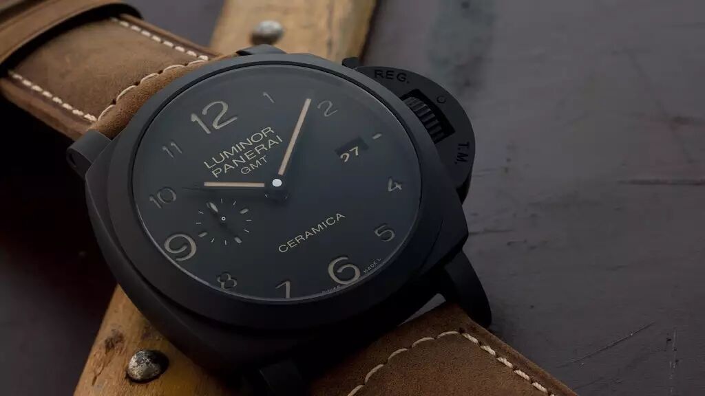 这款LUMINOR系列腕表堪称胖大海中最畅销的款式之一。它保留了小秒针的同时还增加了细长的箭头指针指示GMT两地时。腕表上12、9、6三处位置的阿拉伯数字明显增大,夜间读数的时候效果更为明显。表壳使用沛纳海独家改良的高科技陶瓷制作,这种陶瓷加入了氧化锆的元素,抗刮防震程度明显优于不锈钢。