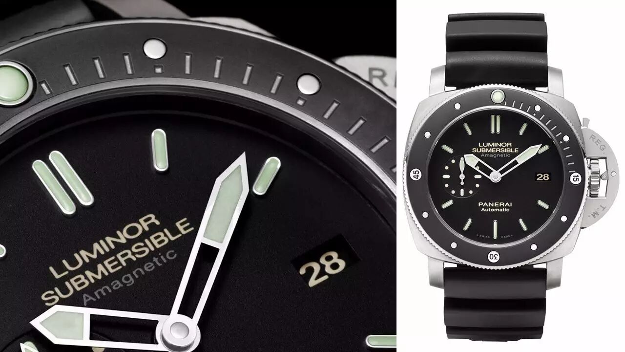 这款47毫米超大尺寸的沛纳海的表壳使用磨砂钛金属打造,块头大,但却不重,还保持了很高的坚硬程度。钛金属与陶瓷表圈相结合,边缘打造了密集整齐的深坑纹,方便调节。表盘上除了经典的9点小秒盘,3点位置还增加了日历显示,当然还有标志性的护桥表冠。