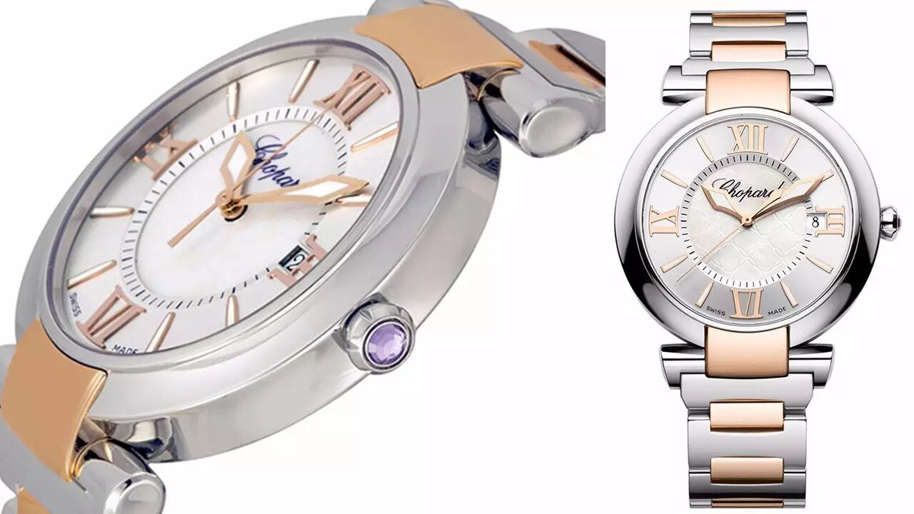 这款自动上链的18K玫瑰金和精钢IMPERIALE腕表以其精致表链展现过人设计。,精致的弯曲指针灵感源自帝国时期,贵气高雅的罗马数字指示时间,表冠上镶嵌了一颗夺目的凸圆形紫水晶,令人想起拜占庭王室钟爱的皇家紫色。