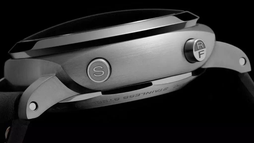这是沛纳海在2013年的巴塞尔钟表展上发布的一款带有飞返计时功能的腕表。表盘上9点位置的小秒盘原封不动的保留,增加了一银一蓝两根细长的指针。蓝色的为计时秒针,银色的则是分针。需要重新计时的时候,无需按下停止按钮,直接按下8点位置的按钮,计时指针会瞬间归零同时重新开始计时,非常方便。
