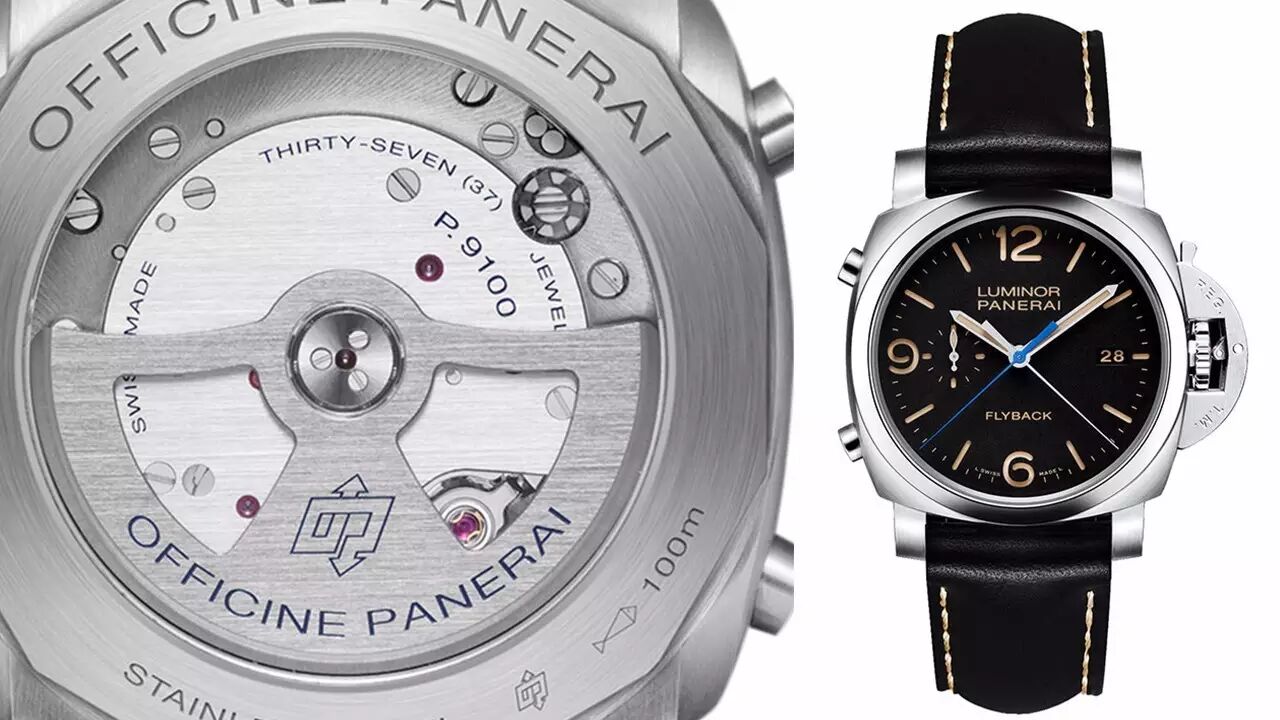 腕表搭载的是沛纳海自主研发的第一款计时机芯P.9100自动上链机械机芯,机芯包含一个垂直离合器和导柱轮,,分针以每60秒移动一格的形式来表现分钟计时,这难免会让人想到名作机芯Lemania 5100。