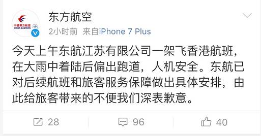 回应称:今天上午东航江苏有限公司一架飞香港航班,在大雨中着陆后偏出跑道,人机安全。东航已对后续航班和旅客服务保障做出具体安排,由此给旅客带来的不便我们深表歉意。