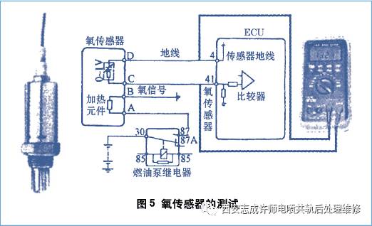 氧传感器是电子控制燃油喷射系统中的重要反馈传感器,它检测排放气体中氧气的浓度,监测发动机是否按理论空燃比燃烧,并向发动机ECU电脑反馈。它是由能产生电动势的二氧化锆电解质及重要电极组成,当混合气浓时排放气体中的氧比较少,大气中的氧离子通过二氧化锆差值大,产生一较高电压;当混合气比较稀时排放气体中的氧比较多,大气中的氧离子通过二氧化锆差值小,产生一较低电压。