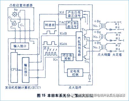 以丰田车系无分电器DLI点火系统的电路图为例来介绍汽车专用表检查该系统的方法:由检测曲轴转角的凸轮轴位置传感器、控制电脑(ECU)及点火组件,根据凸轮轴位置传感器的信号,选择应该点火的汽缸,并把点火信号输送给点火组件,点火线圈直接向火花塞送高压电。这个系统最主要的特点是一个点火线圈给两个汽缸同时点火,一个缸处于排气,该火花为废火花。