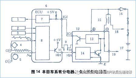 以日本丰田车系有分电器的电子点火系统电路图为例来介绍汽车专用万用表检查该系统的方法:该电路的原理是发动机ECU电脑根据曲轴转角等传感器,确定点火时间。发动机ECU将点火信号IGT送给点火控制单元,当IGT信号变为低电位时,点火线圈的初级电流被切断,次级感应出高压电,再由分电器送至各缸点火。该电路同时具有控制点火时间和点火能量功能,当点火线圈初级电流被切断时,初级线圈产生自感电动势触发信号,点火控制单元发生电路输出一个点火确认信号IGF给发动机ECU电脑,能监视点火控制电路是否正常工作。