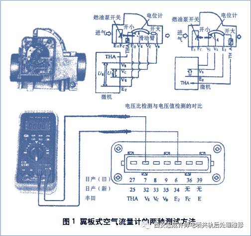 翼板式空气流量计动态测试方法:关闭附属电路设备、启动发动机,并使其怠速运转至稳定后,用汽车专用万用表的DC档,测量滑动触点臂输出端和信号电压负端,怠速时输出电压应为2V左右,做加速和减速试验。将发动机转速从怠速加至油门全开,油门全开持续2秒,但不要使发动机超速运转。在加速的时候,注意观察数字表的电压是否从1V逐渐跳变到约4V;再将发电机降至怠速并保持2s,电压的读数在减速时应降到2V左右。此时按动数字表上的(MAX/MIN动态记录键),电压最大值约4V,最小值约1V,则该传感器正常。如果最大值等于或高于4.5±0.3V,说明流量计信号误差过大;如果最小值为0,说明流量计电阻有断路的地方。全减速(急抬油门)时输出电压并不是非常快地从全加速电压回到怠速电压,通常(除丰田汽车外)翼板式空气流量计输出电压随着进气量的增加而升高。
