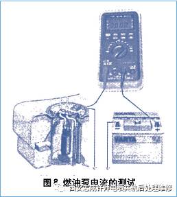 在实际维修时燃油泵的工作电流测试,可以帮助确诊一些燃油泵间断性的故障。测试时使用汽车专用表的电流档(A),按功能键(SELECT)调到直流(DC)档,串在燃油泵线路上。在燃油泵工作时按下动态记录键(MAX/MIN)。当车辆行驶中发现供油异常时观察自动记录的最大值和最小值电流,用以和正常值对比,找出故障原因。