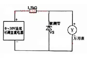 用0~30V连续可调直流电源,对于13V以下的稳压二极管,可将稳压电源的输出电压调至15V,将电源正极串接1只1.5k限流电阻后与被测稳压二极管的负极相连接,电源负极与稳压二极管的正极相接,再用万用表测量稳压二极管两端的电压值,所测的读数即为稳压二极管的稳压值。若稳压二极管的稳压值高于15V,则应将稳压电源调至20V以上。(如图所示)