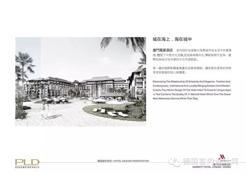 ►厦门万豪酒店,是由享誉全球的万豪国际集团经营管理,并由PLD刘波设计顾问(香港)有限公司担纲室内设计。PLD刘波设计顾问有限公司,在香港及深圳均设有办公室,是目前最具创造力的国际化专业酒店室内设计公司之一,在创始人刘波(Paul Liu)先生的带领下,以近二十年的良好信誉和稳健的经营作风使公司稳步成长。PLD在与多个国际品牌酒店管理公司及酒店开发商合作过程中,积累了众多成功合作的经验,深谙五星级酒店功能及形式的和谐统一之道,成功将国际酒店管理理念和价值观与每个项目的当地特色完美结合。