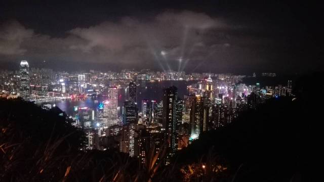 夜晚我们乘坐大巴到达太平山顶。很幸运山顶没有雾视野很好,在这里我们能俯瞰大半个香港夜景。远处直射天际而又不断变换的光束与这边IGC大楼的灯光相互映衬,香港之眼与最高的楼的倒映在静静的维多利亚港,这样的情景吸引同学们驻足观看。