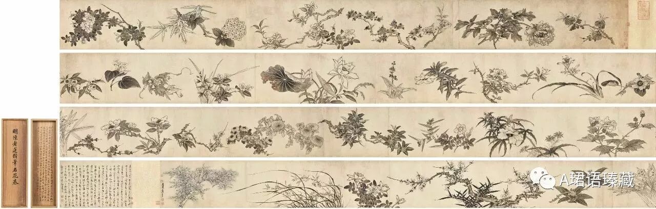 陈洪绶写的同类主题精品,有北京故宫博物院藏《杂画图册》,上海博物馆藏《花鸟图册》、《春风蛱蝶图》,南京博物院藏《竹石萱草图》,台北故宫博物院藏《花蝶写生图》,美国大都会博物馆藏《杂画册》等,综观所得,鲜有长卷花卉,此卷书画合一,是非常难得的精品。