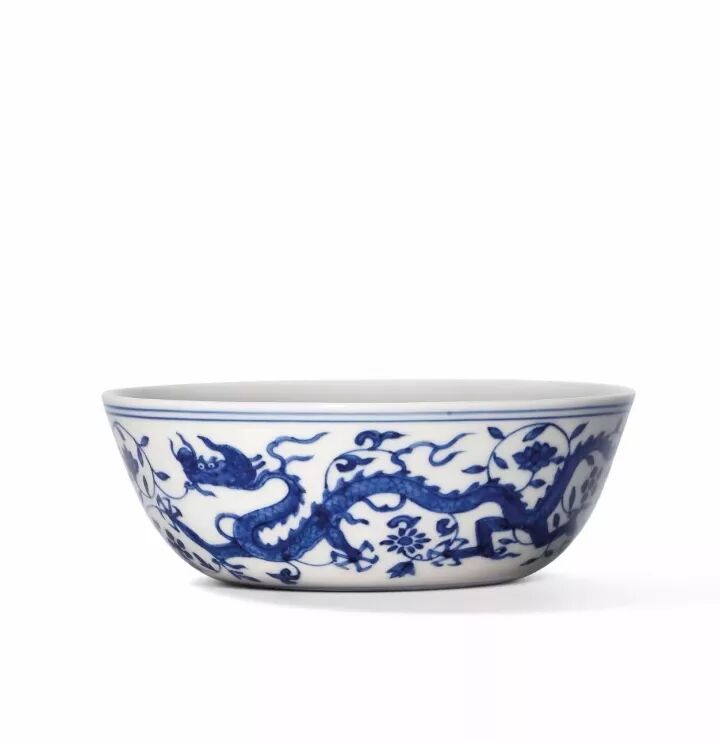 器外壁绘两组五爪行龙,每组以火珠为中心,奔腾于祥云及寿山福海之间,唇口平沿饰卷草纹,外口沿绘古钱纹,内口沿青花横书「大明隆庆年造」楷书款。