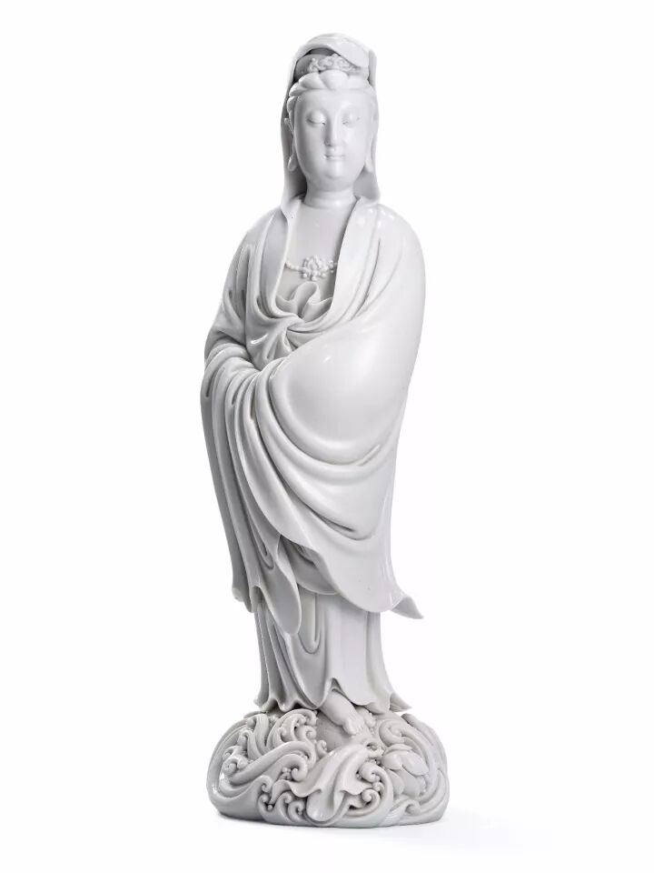 观音,即观世音菩萨,《普陀洛迦新志》卷十记:「及万历中,为极盛。」证明观音奉祀在万历年间极为鼎盛。基于观音信仰与航海外销贸易有着密切关系,故渡海观音形象多见以神情自若,临风飘拂,但足下却波涛翻滚,宛如乘风破浪。福建德化窑因靠海之便,其所作之瓷塑多以释道为主,至晚明期间,工艺则更臻于巅峰,尤以何朝宗创作之观音造像因面目生动,衣纹遒劲,而被视为上乘之作,加上传世数量精罕艺绝,大件作品则更显寥若晨星。
